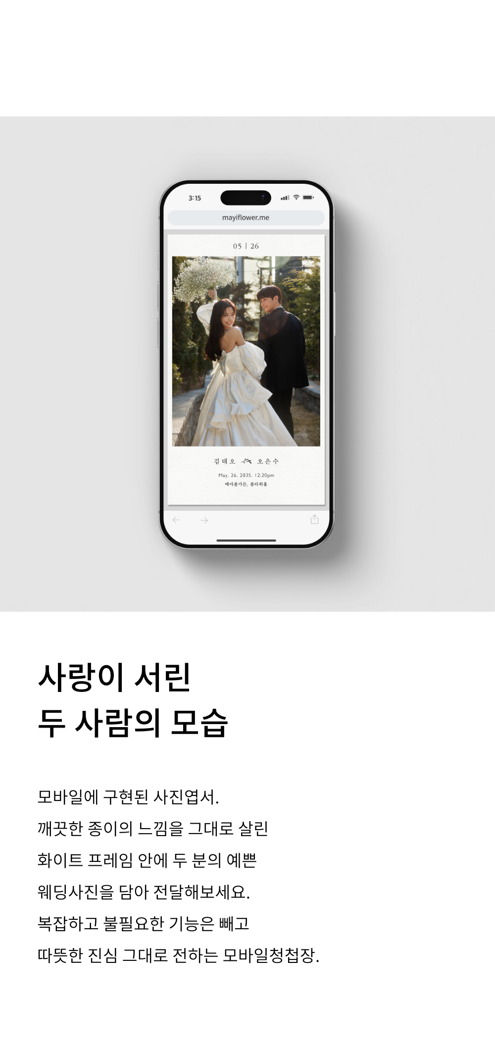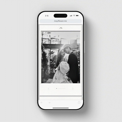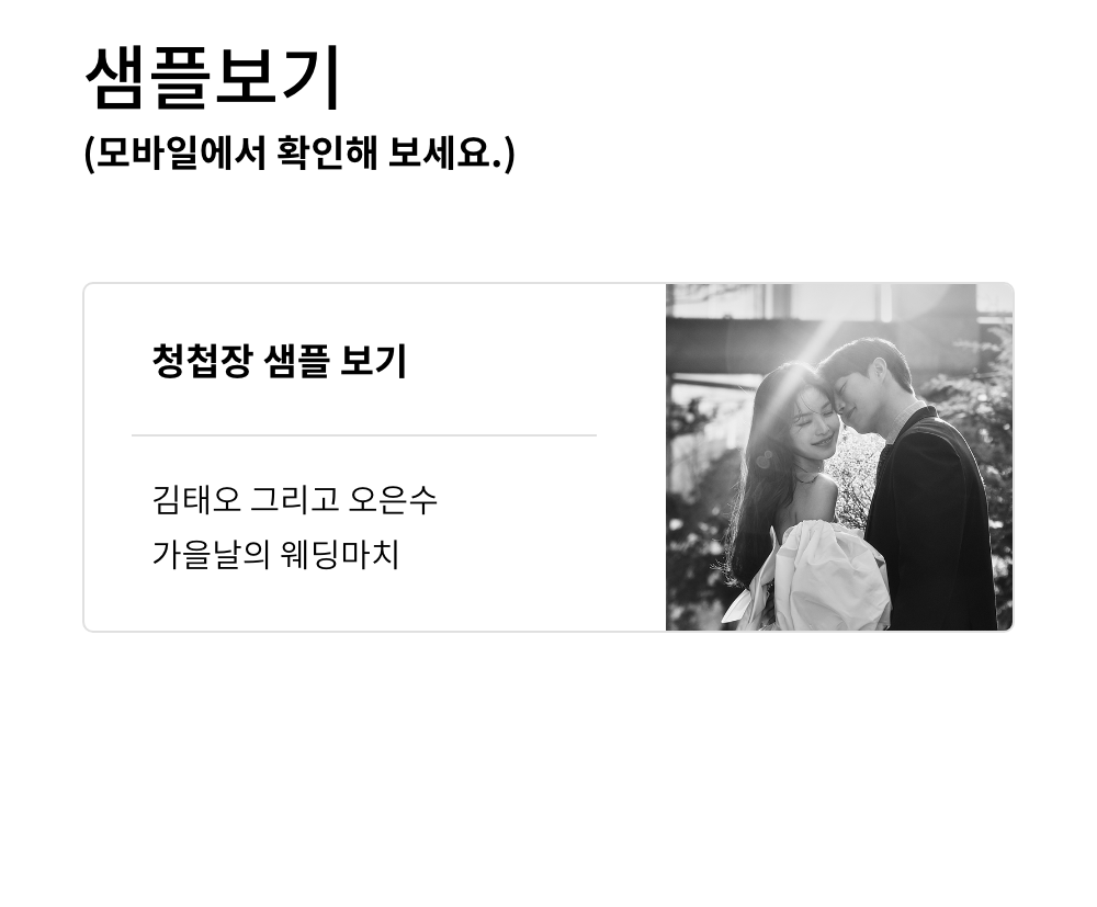 모바일에 구현된 사진엽서. 깨끗한 종이의 느낌을 그대로 살린 화이트 프레임 안에 사랑이 서린 두 분의 아름다운 웨딩사진을 담아 전달해보세요.